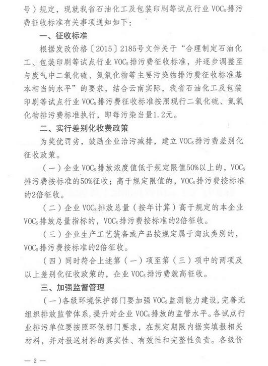 日前,北极星节能环保网从云南省环保厅获悉,关于云南省石油化工及包装印刷等试点行业挥发性有机物排污费征收标准的通知已经下发。通知规定,云南省石油化工及包装印刷等试点行业VOCs(挥发性有机物)排污费征收标准按照现行二氧化硫、氮氧化物排污费标准执行,即每污染当量1.2元。为奖优惩劣,鼓励企业治污减排,建立VOCs排污费差别化征收政策。企业VOCs排放浓度值低于规定限值50%以上的,VOCs排污费按标准的50%征收;高于规定现值的,VOCs排污费按标准的2倍征收。企业VOCs排放总量(按年计算)高于规定的本企业VOCs排放总量指标的,VOCs排污费按标准的2倍征收。企业生产工艺装备或产品按规定属于淘汰类别的,VOCs排污费按标准的2倍征收。同时符合上述中的两项及以上差别化征收政策的,企业VOCs排污费就高征收。通知于明年1月1日起执行。详情如下: