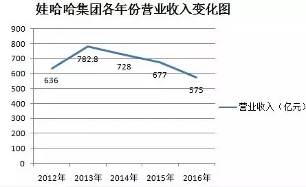作为国内传统快消巨头,娃哈哈正在经历痛苦转型期。2012年,娃哈哈的营业收入为636亿元,同比下滑了5%,这是娃哈哈首度遭遇业绩下滑,在2013年短暂的上涨之后,2014年,娃哈哈的营业收入为728亿元,比2013年下降了7%,2015年降至677亿元,2016年继续降至575亿元。
