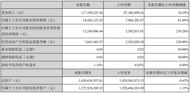 报告期内,金明精机生产经营稳健,实现营业收入11,735.02万元,同比增长34.29%;归属于上市公司股东净利润1,442.61万元,同比增长81.09%。